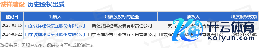 本站讯息现金九游体育app平台,凭据天眼查APP深入,在1月15日登记的一则股权出质信息(登记编号:653123202500000001)中,山东诚祥成就集团股份有限公司出质其所握有的新疆诚祥建筑安设有限牵扯公司股权,出质股权数额为4000万元,质权东谈主为英吉沙县农村信用融合联社。