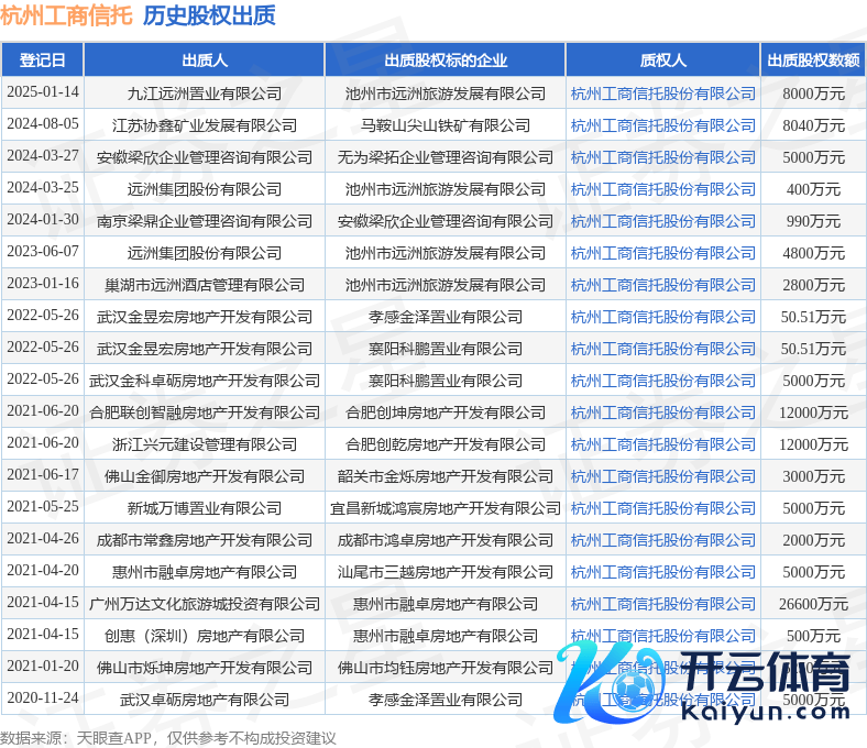 本站音问,凭证天眼查APP线路,在1月14日登记的一则股权出质信息(登记编号:341723202500000002)中,九江远洲置业有限公司出质其所握有的池州市远洲旅游发展有限公司股权现金九游体育app平台,出质股权数额为8000万元,质权东说念主为杭州工商相信股份有限公司。