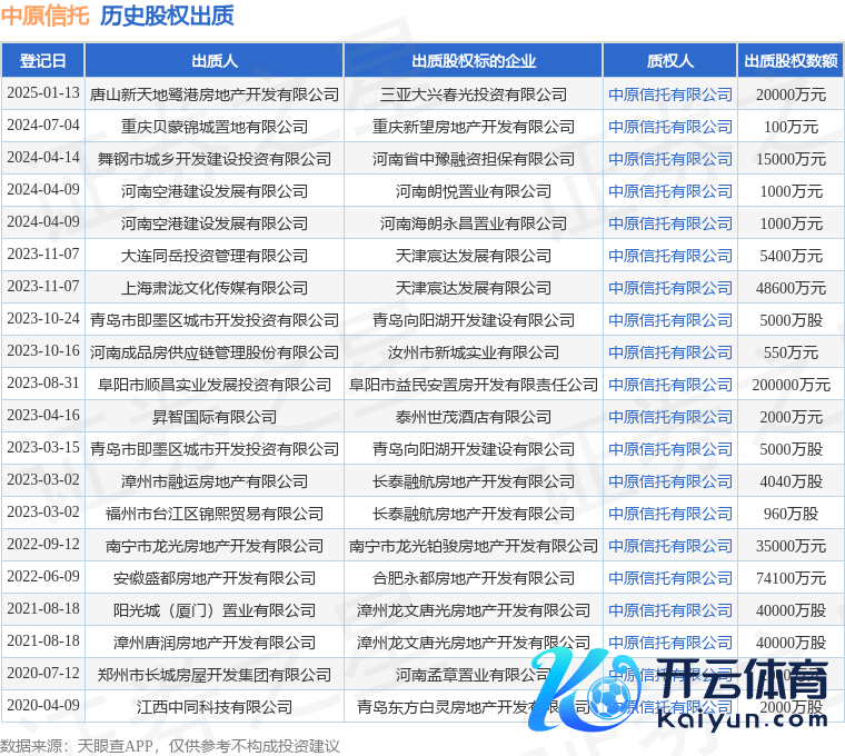 本站音讯,说明天眼查APP清爽九游体育app官网,在1月13日登记的一则股权出质信息(登记编号:460000202500000029)中,唐山新天下鹭港房地产开辟有限公司出质其所捏有的三亚大兴春光投资有限公司股权,出质股权数额为20000万元,质权东说念主为华夏相信有限公司。